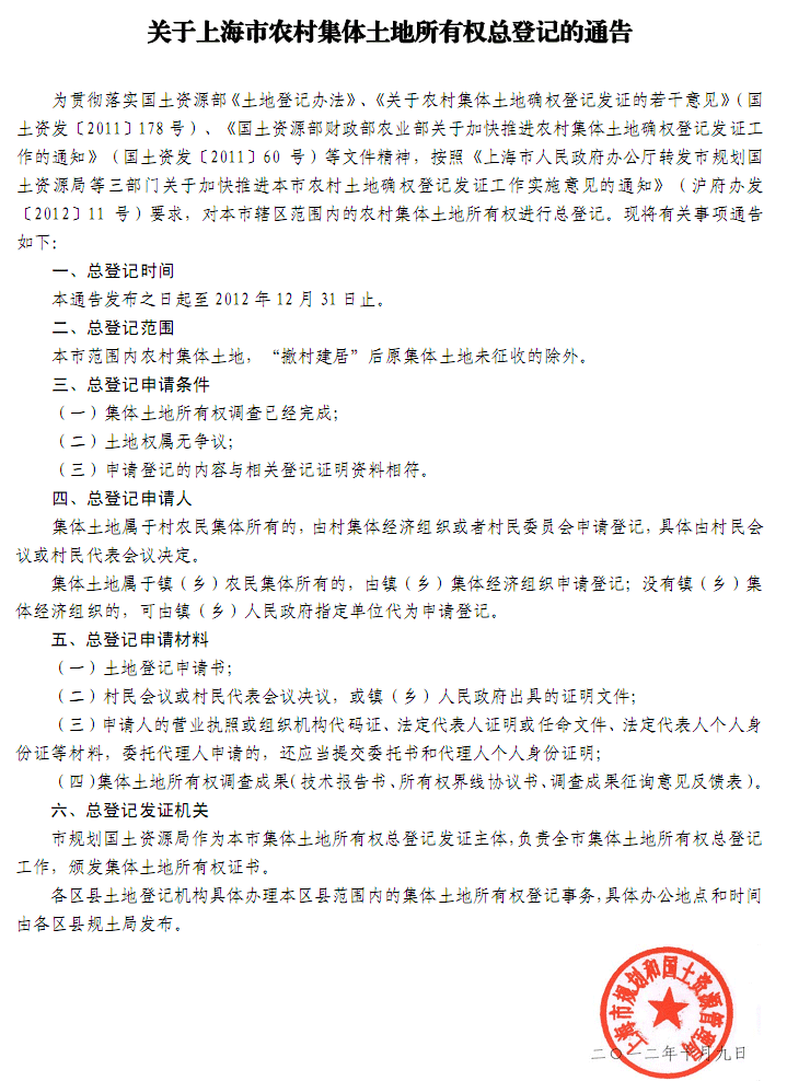 关于上海市农村集体土地所有权总登记的通告